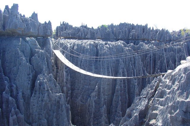 E' arrivato il grande giorno verso il GrandeTsingy, le piste sono più difficili ma anche molto più spettacolari, arriviamo in un'immensa foresta costituita da pinnacoli carsici, possiamo vedere alcuni Tsingy che si erigono alti come grattacieli per diverse centinaia di metri, proseguiamo a piedi per un percorso di trekking, non senza brividi effettuiamo il passaggio sul ponte sospeso, sotto di noi impressionanti sono i pinnacoli, non è troppo difficile effettuare questa escursione, certamente non bisogna soffrire di vertigini, uno sguardo giù dal ponte sospeso è da evitare potrebbe provocare come minimo un giramento di testa oppure uno svenimento, procediamo attraverso passarelle con imbracature e ganci di sicurezza fra una flora e una fauna incontaminata fino alla "cattedrale di roccia" da cui si gode una vista infinita spettacolare sul Grande Tsingy. Rientriamo in hotel e per concludere dopo la cena facciamo una passeggiata notturna in cerca del piccolo lemure pigmeo, comunque nessuna traccia dell'esserino purtroppo.. in compenso illuminati dalle torce riusciamo a vedere un'infinità di camaleonti.